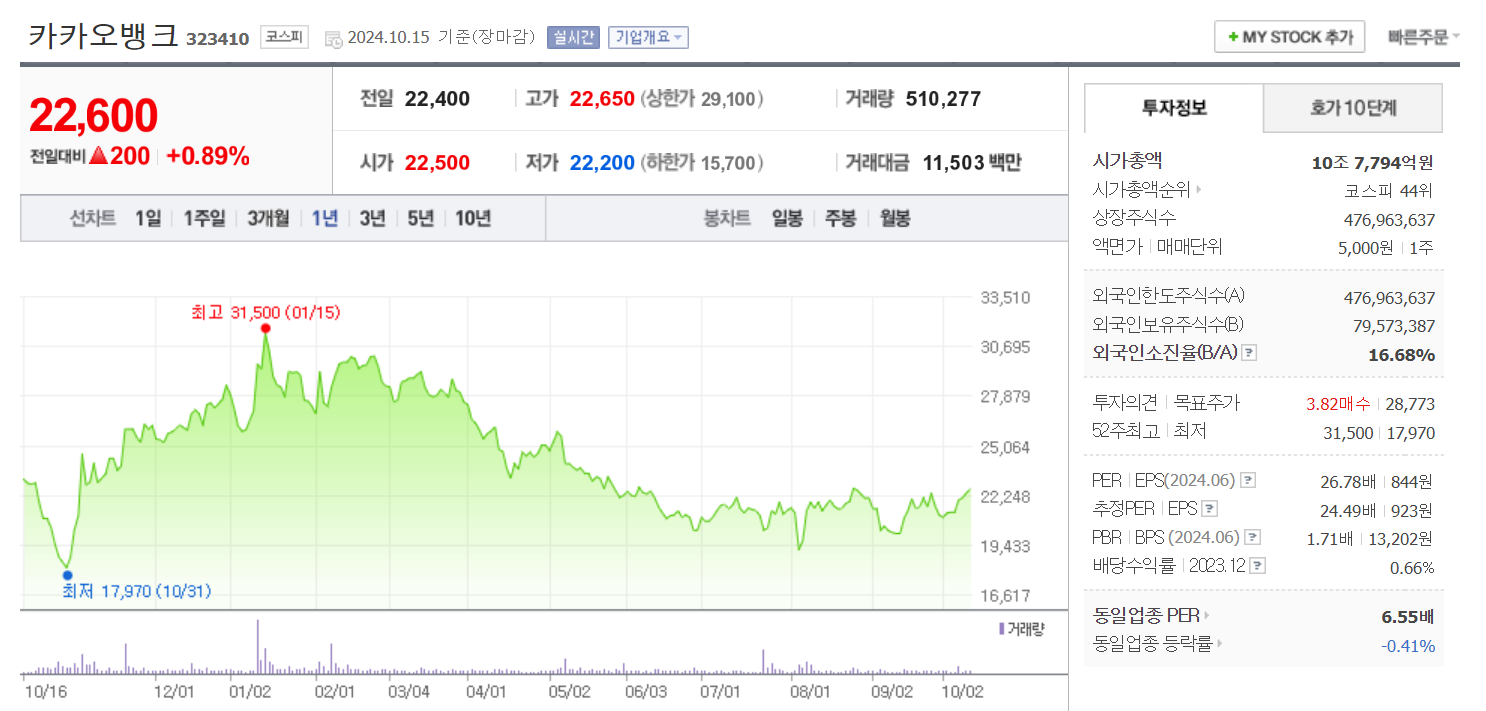 단기 포트폴리오를 구성한다면 시가 총액과 장중 거래량도 꼭 살펴봐야 합니다. 카카오뱅크의 시가 총액은 10조7794억 원이며 장중 거래량은 581,502원 을 기록했습니다. 대주주의 정보는 크게 중요하지 않을 수도 있으나 장기적으로는 확인하는 것이 좋습니다.