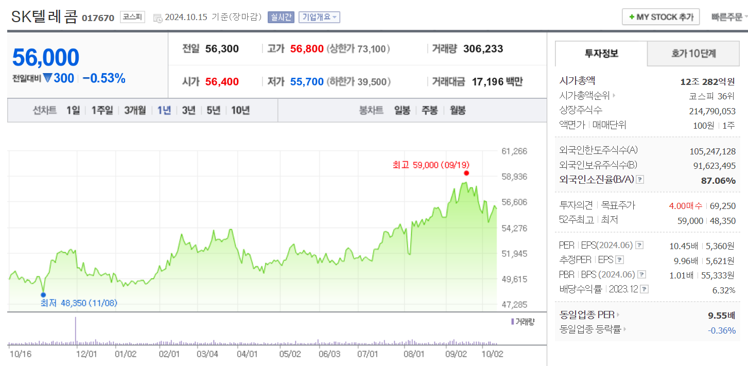 SK텔레콤의 현재 주가는 56,300원입니다. 전일 대비 -3.43원 이동한 모습입니다. 시가 총액은 12조282억 원이며 발행 주식은 총 214,790,053주 입니다. 외국인이 보유한 비중은 42.66%입니다. SK텔레콤 기업의 영업이익은 억 원을 달성했으며 배당 수익율은 7.07% 입니다.