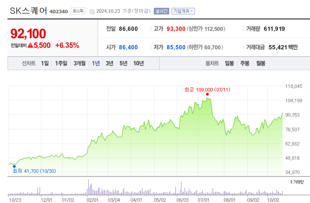 SK스퀘어의 현재 주가는 86,600원입니다. 전일 대비 -100원 이동한 모습입니다. 시가 총액은 12조4105억 원이며 발행 주식은 총 134,749,960주 입니다. 외국인이 보유한 비중은 52.74%입니다. SK스퀘어 기업의 영업이익은 억 원을 달성했으며 배당 수익율은 % 입니다.