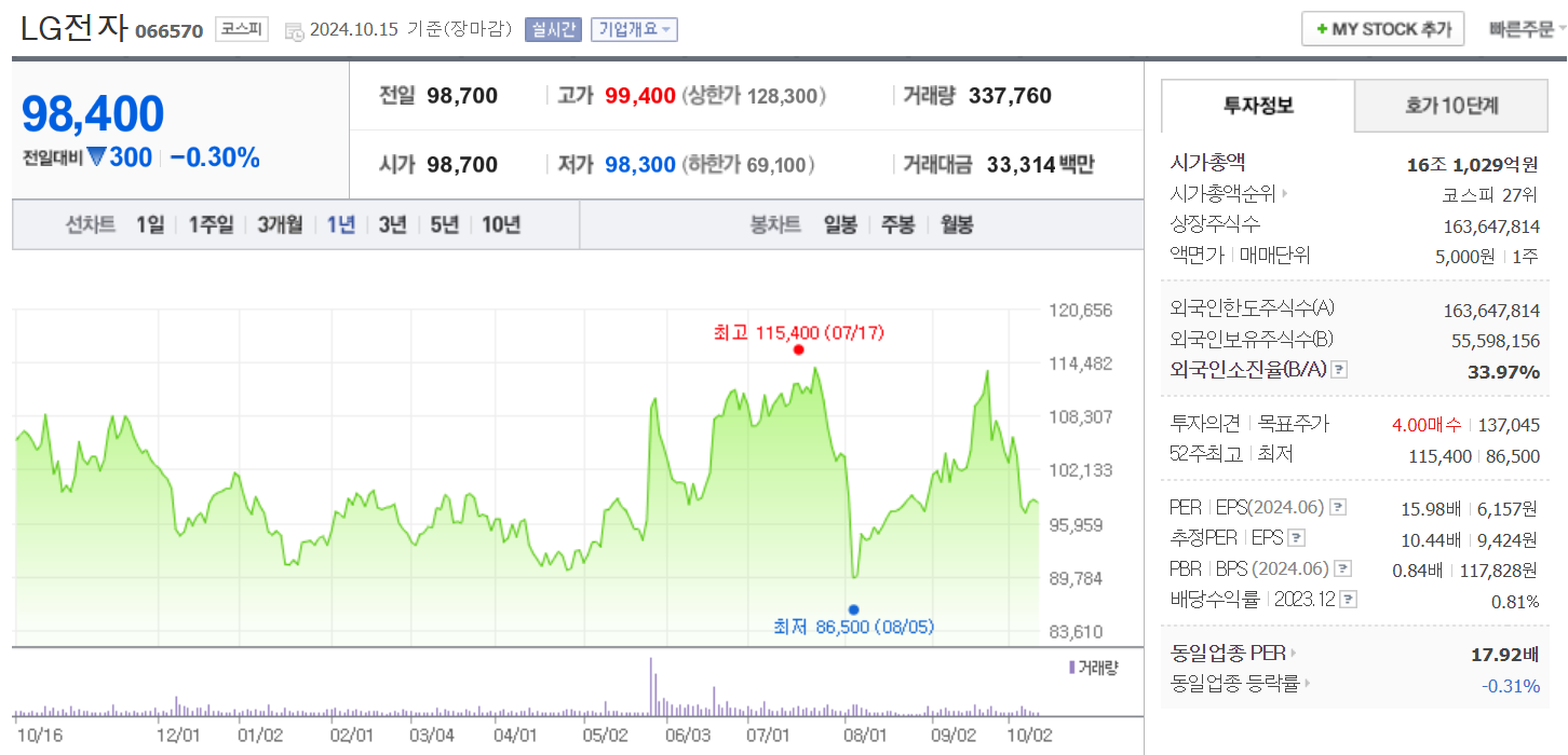 LG전자의 현재 주가는 98,700원입니다. 전일 대비 -5.46원 이동한 모습입니다. 시가 총액은 16조1029억 원이며 발행 주식은 총 163,647,814주 입니다. 외국인이 보유한 비중은 33.97%입니다. LG전자 기업의 영업이익은 억 원을 달성했으며 배당 수익율은 0.79% 입니다.