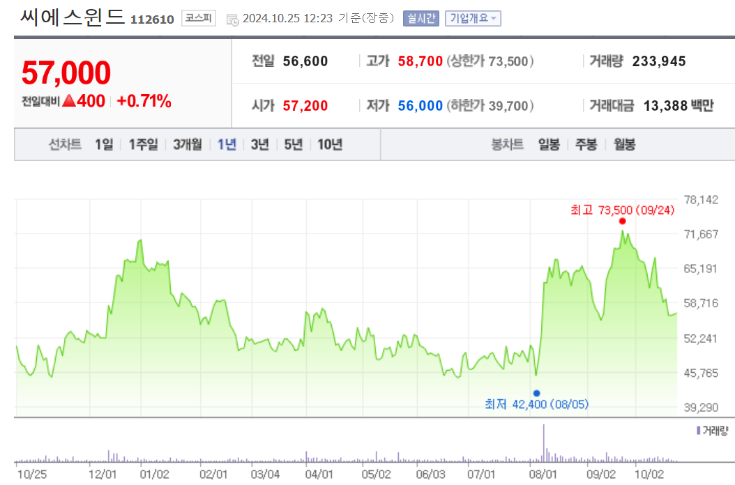 만약 단기 포트폴리오를 구성한다면 시가 총액과 장중 거래량을 살펴봐야 합니다. 씨에스윈드의 시가 총액은 2조3911억 원이며 장중 거래량은 233,800원 을 기록했습니다. 대주주의 정보는 크게 중요하지 않지만 장기적인 관점에서는 확인하는 것이 좋겠습니다.