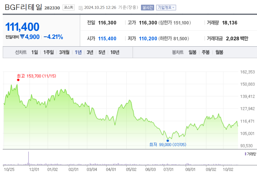 BGF리테일의 현재 주가는 116,300원입니다. 전일 대비 -5.68원 이동한 모습입니다. 시가 총액은 1조9237억 원이며 발행 주식은 총 17,283,906주 입니다. 외국인이 보유한 비중은 31.80%입니다. BGF리테일 기업의 배당 수익율은 3.12% 입니다.