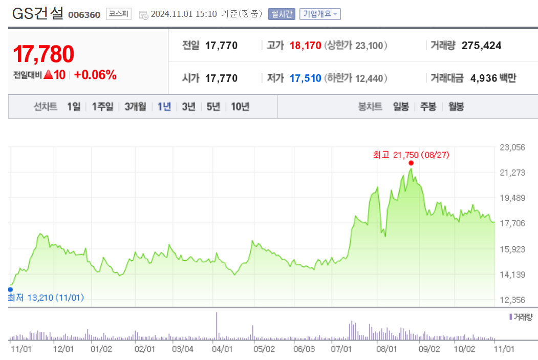 시가 총액과 장중 거래량을 살펴보면 단기 포트폴리오 구성에 도움이 됩니다. GS건설의 시가 총액은 1조5208억 원이며 장중 거래량은 385,472원 을 기록했습니다. 대주주의 정보는 크게 중요하지 않을 수도 있으나 장기적인 관점에서는 확인해보는 것이 좋겠습니다.