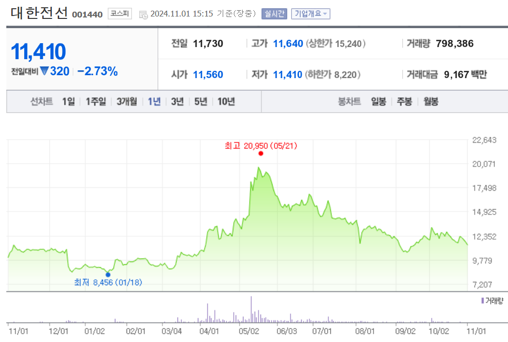 단기 포트폴리오를 구성할 경우 시가 총액과 장중 거래량을 살펴봐야 합니다. 대한전선의 시가 총액은 2조1292억 원이며 장중 거래량은 1,053,737원 을 기록했습니다. 대주주의 정보는 크게 중요하지 않을 수도 있으나 장기적으로는 확인하는 것이 좋습니다.