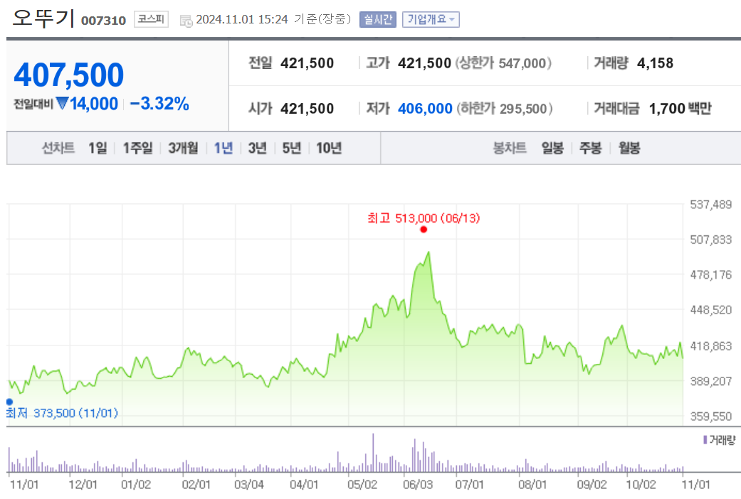 오뚜기의 현재 주가는 421,500원입니다. 전일 대비 -1.17원 이동한 모습입니다. 시가 총액은 1조6292억 원이며 발행 주식은 총 4,007,830주 입니다. 외국인이 보유한 비중은 12.17%입니다.