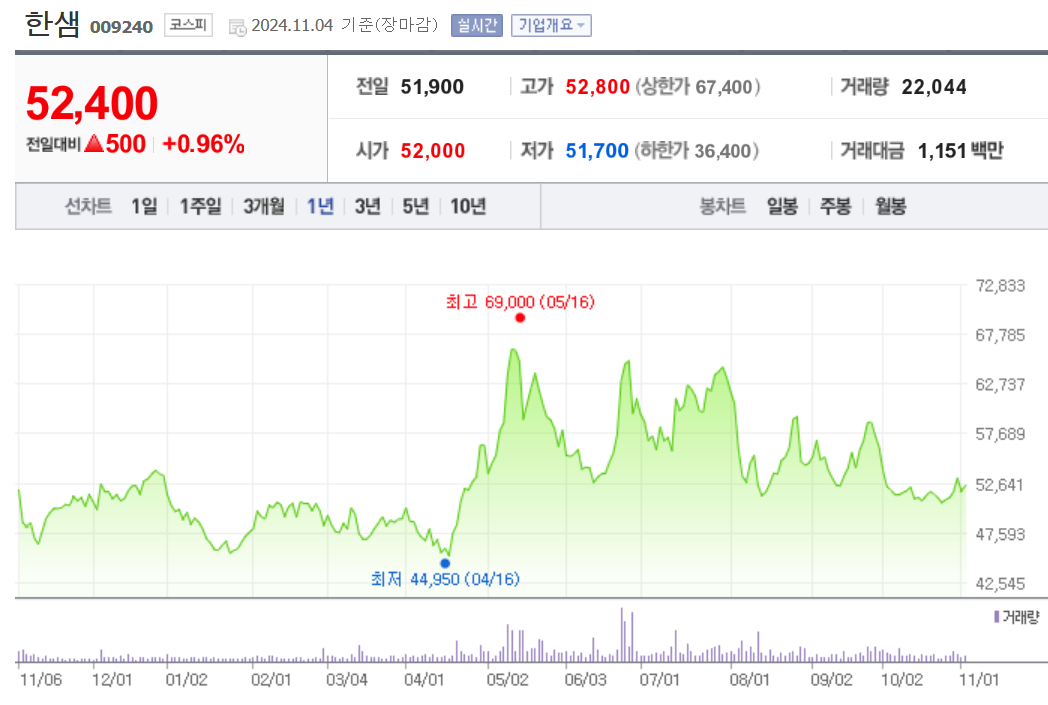 단기 포트폴리오를 구성한다면 시가 총액과 장중 거래량도 살펴봐야 합니다. 한샘의 시가 총액은 1조2332억 원이며 장중 거래량은 20,835원 을 기록했습니다. 대주주의 정보는 크게 중요하지 않을 수도 있으나 장기적으로는 확인해보는 것이 좋겠습니다.