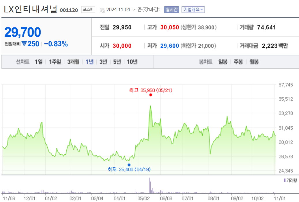 LX인터내셔널의 현재 주가는 29,950원입니다. 전일 대비 -550원 이동한 모습입니다. 시가 총액은 1조1512억 원이며 발행 주식은 총 38,760,000주 입니다. 외국인이 보유한 비중은 23.83%입니다.