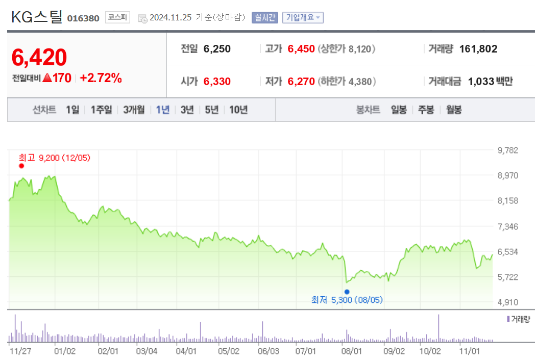 단기 포트폴리오를 구성할 경우 시가 총액과 장중 거래량을 살펴봐야 합니다. KG스틸의 시가 총액은 6421억 원이며 장중 거래량은 167,292원 을 기록했습니다. 대주주의 정보는 크게 중요하지 않을 수 있지만 장기적인 관점에서는 확인이 필요합니다.