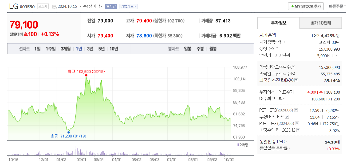 LG의 현재 주가는 79,000원입니다. 전일 대비 -5.95원 이동한 모습입니다. 시가 총액은 12조4425억 원이며 발행 주식은 총 157,300,993주 입니다. 외국인이 보유한 비중은 35.14%입니다. LG 기업의 영업이익은 억 원을 달성했으며 배당 수익율은 3.61% 입니다.