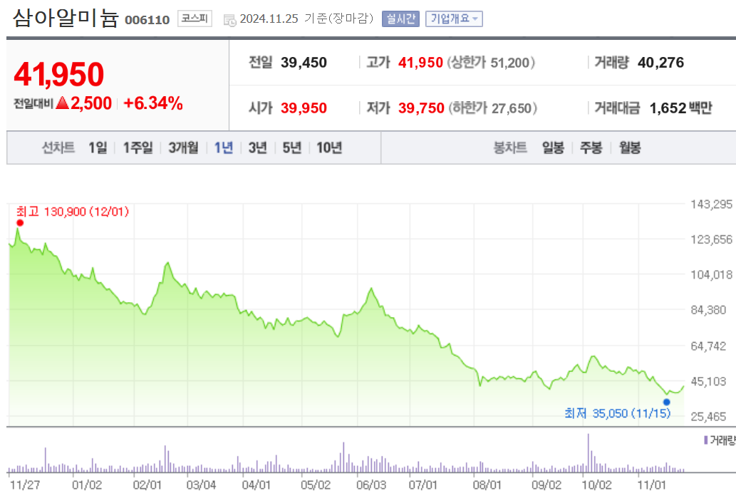 삼아알미늄의 현재 주가는 39,450원입니다. 전일 대비 -19.82원 이동한 모습입니다. 시가 총액은 6172억 원이며 발행 주식은 총 14,711,916주 입니다. 외국인이 보유한 비중은 39.57%입니다.