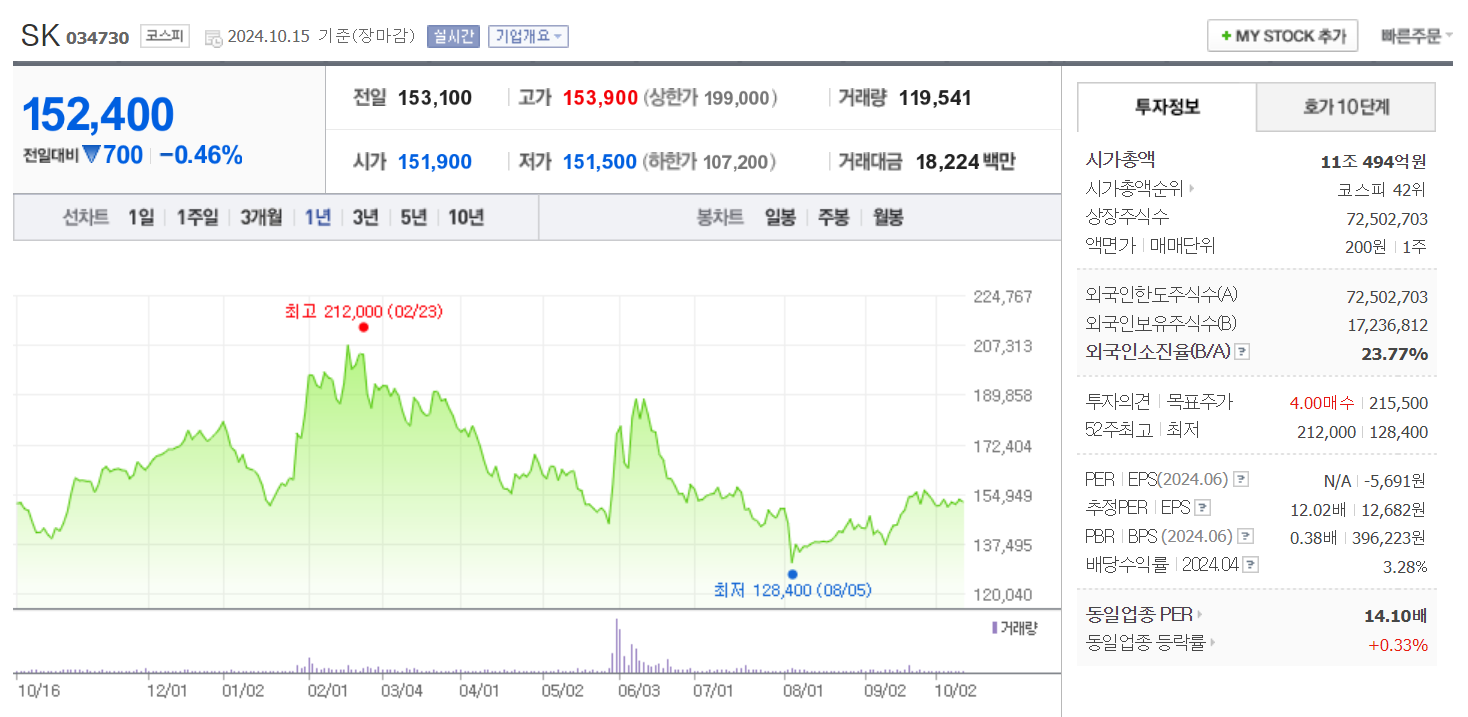SK의 현재 주가는 153,100원입니다. 전일 대비 -1.29원 이동한 모습입니다. 시가 총액은 11조494억 원이며 발행 주식은 총 72,502,703주 입니다. 외국인이 보유한 비중은 23.77%입니다. SK 기업의 영업이익은 억 원을 달성했으며 배당 수익율은 2.81% 입니다.